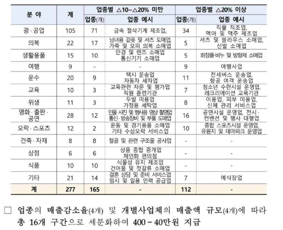 국세청 부가세 신고 매출액이 19년 대비 20년에 10%이상 감소한 13개분야 277업종으로 업종의 매출감소율및 개별사업체의 매출액 규모에 따라 총 16개구간으로 세분화 하여 400~40만원을 지급합니다 .