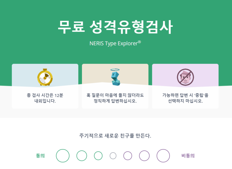 mbti 성격유형별 퀴즈 테스트 성격 검사의 경우 총 검사 시간은 12분 내외입니다. 질문이 마음에 들지 않아도 정직하고 솔직하게 대답해야 자신의 성격이 정확히 나옵니다. 아마 대개 12분 내외이 시간이면 내 성격을 파악할 수 있어요. 시간이 많이 걸리는 사람도 있지만 대개 그 정도면 끝나더라구요.