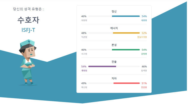 신기하게도 제가 오래전에 성격 유형 검사를 했을 때는 다른형이었는데 , 나이가 들어서 그런지 수호자형이 나왔네요. 실제로 살아가면서 자신의 성격이 여러가지로 바뀔 수 있다고 들었는데, 이렇게 검사를 통해 이를 알게 되고 확인까지 할 수 있어서 정말 신기합니다.