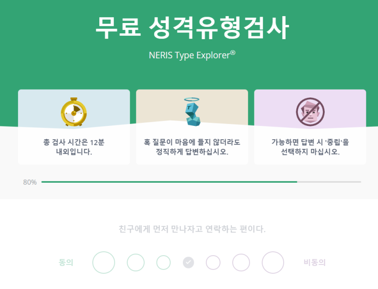 총 질문 중 얼마나 진행하는지 화면 상단에 퍼센트(%)로 알려줍니다. 위의 화면을 보니 80%가 진행이 되었다고 나오죠. 총 60문제나 되니 이게 많다고 생각할 수도 있어요. 지겹다는 생각까지 들 수 있지만 정확하게 내 성격을 파악하기 위한 것이에요. 자신이 생각하고 느낌 가는 대로 솔직하게 바로바로 체크하면 됩니다. 그렇게 부담느끼지 말고 5분 정도만 투자하면 mbti 테스트 끝낼 수 있어요.